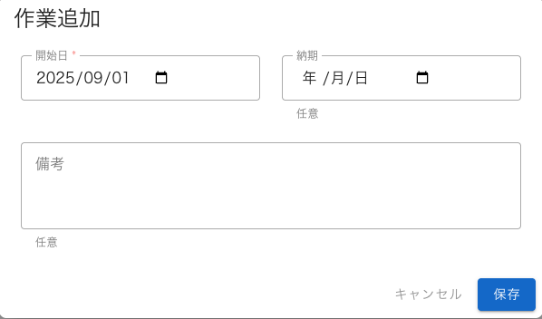 右上の「+作業追加」を押すと次のダイアログが現れます。開始日だけ必須です。今日は9/23なのですが、練習用には少し遡った日付のほうがいいので9/1を入力します。納期と備考は空欄でいいです。