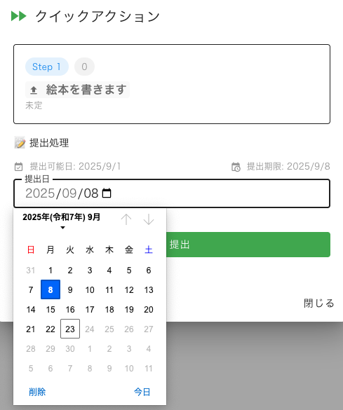 この画面で黄色マーカーで囲んだ☑️(チェックマーク)アイコンを押すと先程のログ一覧画面に戻ります。そこで、ログ一覧画面で黄色マーカーで囲んだ⏩️(早送り)アイコンを押すと「クイックアクション」のダイアログが登場します。「提出日」をカレンダーから選んで「提出」ボタンを押すと提出日が記入されます。