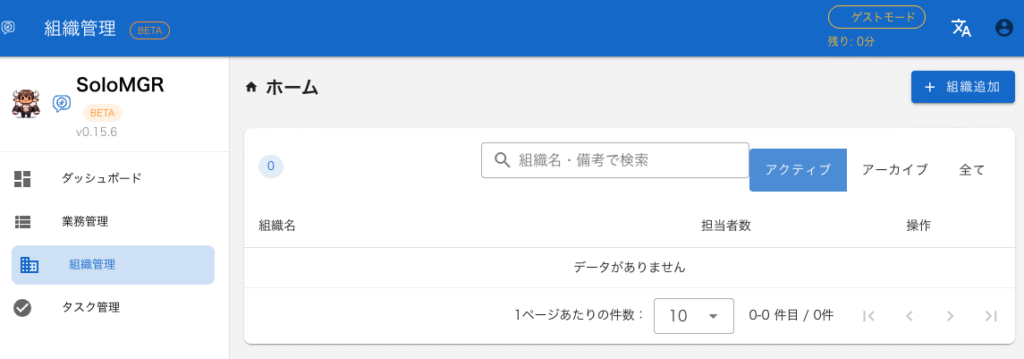 左のナビゲーション・メニューから「組織管理」を選択すると次の画面になります。