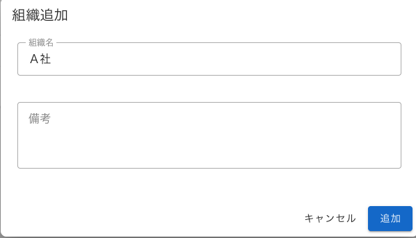 ここで右上の「+組織追加」を押すとダイアログが表示されるので組織名「A社」を記入して「追加」を押します。備考は記入しなくてもいいです。