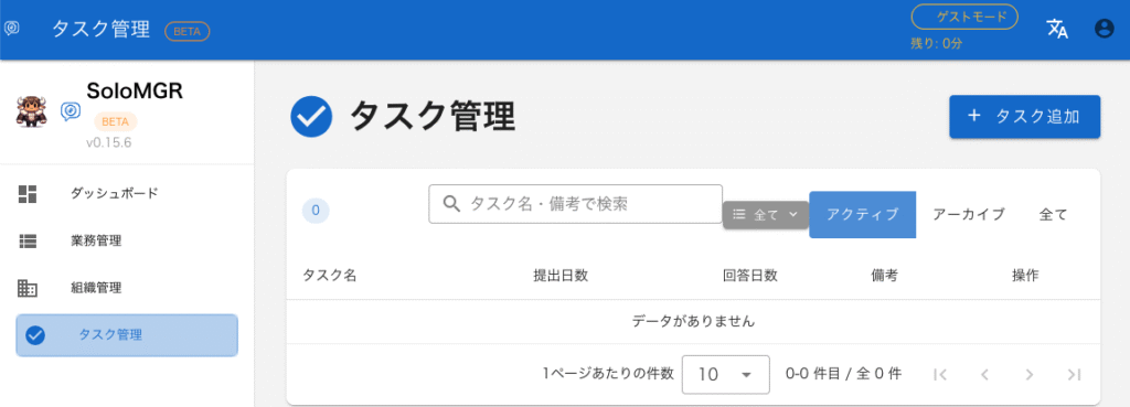ナビゲーション・メニューで「タスク管理」をクリックしたら次の画面になります。