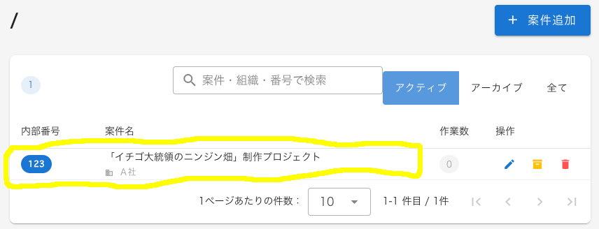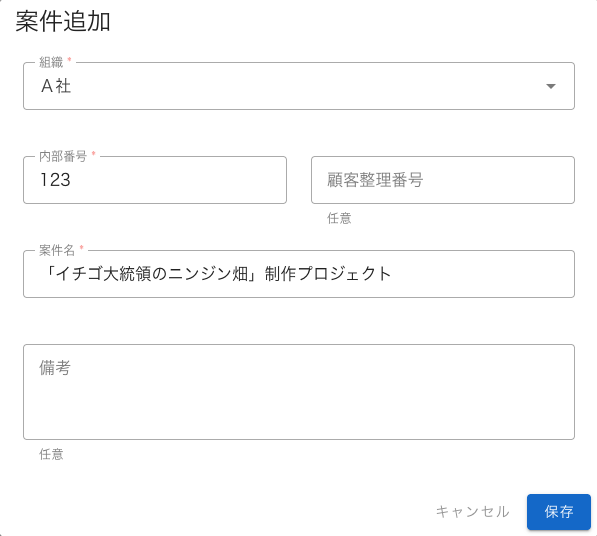 ここで右上の「+案件追加」を押すと案件を追加する次のダイアログが現れます。ここでは組織のプルダウンメニューから「A社」を選び、内部番号に「123」を記入し、適当な案件名を記入して保存してください。
